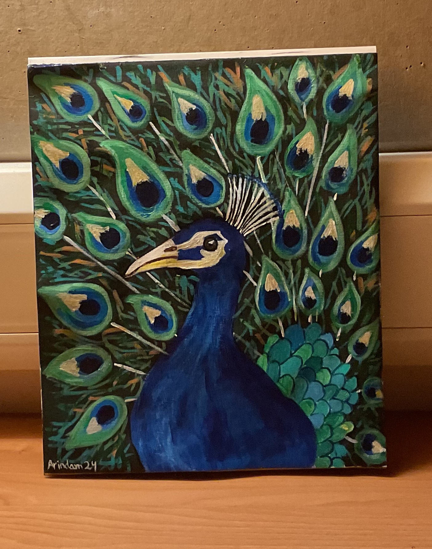 Arindam Mehra’s painting captures the symbolism of the peacock, India’s national bird, blending it with the protection of the evil eye motif. The vibrant colours and intricate feathers mirror the connection to Indian traditions, while the talismanic symbolism reflects both protection and resilience. Through this artwork, Mehra beautifully intertwines culture, spirituality, and self-expression, creating a visual reflection of personal heritage that is as powerful as it is elegant.